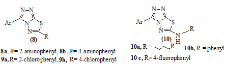 Currently available non-steroidal anti-inflammatory drugs (NSAIDs) like ibuprofen, flurbiprofen, fenbufen and naproxen exhibit gastric toxicity. Literature survey revealed that modification of the carboxyl function of representative NSAIDs resulted in increased anti-inflammatory activity with reduced ulcerogenic effect[6,7]. Compounds bearing 1,2,4-triazole and 1,3,4-thiadiazole nuclei possess significant anti-inflammatory activity with reduced GI toxicity. In order to reduce the toxicity Amir et al.8 have replaced the carboxylic acid group of 2-(4-isobutylphenyl) propanoic acid and biphenyl-4-yloxy acetic acid by a composite system, which combines both the triazole and the thiadiazole nucleus in a ring to give a compact and planar structure. It was interesting to note that seven cyclized compounds 8a, 8b, 9a, 9b, 10a, 10b and 10c were found to have anti-inflammatory properties comparable to their standard reference drugs ibuprofen and flurbiprofen. When these compounds were subjected to analgesic activity by tail immersion method in mice, all compounds exhibited moderate to good activity. These compounds were also tested for ulcerogenic activity and lipid peroxidation, and showed superior GI safety profile along with reduction in lipid peroxidation as compared with ibuprofen and flurbiprofen.