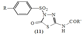Schenone et al.9 synthesized two series of N-[5-oxo-4-(arylsulfonyl)-4,5-dihydro-1,3,4-thiadiazol-2-yl]-amides (11) and tested in vivo for their analgesic and anti-inflammatory activities. All the new compounds possess good analgesic action in the acetic acid writhing test.