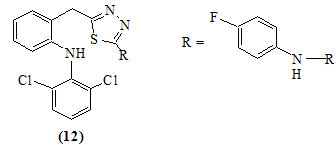 Amir et al.[10] synthesized 1,3,4-thiadiazole derivatives of diclofenac which showed anti-inflammatory activity from 79.04% to 82.85%. The maximum activity (82.85%) was shown by compound 12 having p-fluoro phenyl amino group at second position.