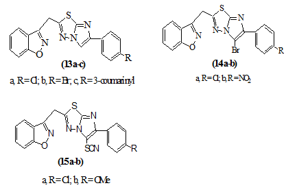 Khazi et al.[11] synthesized novel methylene bridged benzisoxazolyl imidazo [2,1-b][1,3,4]-thiadiazoles. The investigation of antibacterial screening revealed that some of the tested compounds showed moderate to good bacterial inhibition. Particularly compounds 13a, 13b, 14a, 14b and 15a have shown very good antibacterial activity. Compound 15a has exhibited highest antibacterial activity.