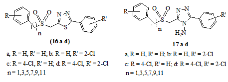 The high activity is attributed to the presence of electron withdrawing chloro and bromo functional groups. Antifungal results indicated that compounds 13b, 13c and 15b have shown good activity. Compound 13b showed very good antifungal activity comparable to that of standard. Padmavathi et al.[12] found that 2-(arylmethanesulfonylmethyl)-5-aryl-1,3,4 thiadiazoles (16a–d) and 3-(arylmethanesulfonylmethyl)-5-aryl-4H-1,2,4-triazol-4-amines (17a–d) exhibited high activity on both Gram (+ve) and Gram (-ve) bacteria. In fact, compounds 16d and 17d showed pronounced activity towards Gram (+ve) bacteria.