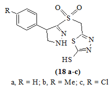 Padmavathi et al.[13] also reported synthesis and biological screening of some novel sulfone-linked bis heterocycles. In which the compounds 18a showed excellent activity against Gram-positive bacteria (inhibitory zone >25 mm), good activity against Gram-negative bacteria (inhibitory zone >20 mm). The compounds (18a-c) have shown high inhibitory effect towards tested fungi.