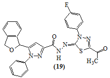Abdel-Wahab et al.[14] reported the synthesis of new 1,3,4-thiadiazole derivatives of 5-(benzofuran-2-yl)-1-phenylpyrazole moiety. All the synthesized compounds were screened against bacterial strains and among them compound 19 was found to possess significant activity against Escherichia coli and C. albicans. The tested compounds did not exhibit any activity against Gram-(+) strains.