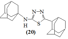 Kadi et al.[15]synthesized of a new series of 5-(1-adamantyl)-1,3,4-thiadiazole derivatives and evaluated them for their antimicrobial activity which revealed that all the synthesized compounds, exhibited better activity than reference drugs (gentamicin and ampicillin) on E. coli and Pseudomonas aeuroginosa. SAR studies have shown that antibacterial activity was greatly diminished on introduction of the benzyl- or 4-substituted benzyl moieties and antifungal activity increased on substitution with adamantly moiety (20) on C-5 of thiadiazole nucleus.
