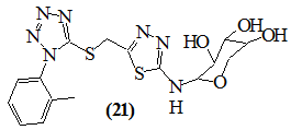 He et al.[16]reported the synthesis of a series of 5-(1-aryl-1H-tetrazol-5-ylsulfanylmethyl)-N-xylopyranosyl-1,3,4-thiadiazole-2-amine derivatives and investigated in vitro antibacterial activity against S. aureus. Among the synthesized compounds, only compound 21 was found to be the most active against tested strain and none of them showed activity against tested fungal strains.