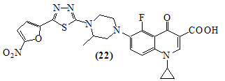 Jazayeri et al.[17] synthesized and evaluated antibacterial activity of gatifloxacin derivatives incorporated with 5-(5-nitroheteroaryl)-1,3,4-thiadiazol-2-yl groups at C-7 position. The presence of nitrofuran (22) at C-2 of thiadiazole ring caused complete inhibition of DNA gyrase or DNA topoisomerase IV and exhibited more potent inhibitory activity against Gram-positive bacteria including S. epidermidis (MIC = 0.0078 μg/ml), B. subtilis (MIC = 0.0039 μg/ml), E. Faecalis (MIC = 0.125 μg/ml), nd M. luteus (MIC = 0.125 μg/ml).
