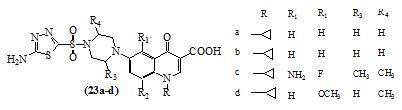 Talath et al.[18] synthesized a series of 7-[4-(5-amino-1,3,4 thiadiazole-2-sulfonyl)]-1-piperazinyl fluoroquinolone derivatives 23a–23d and evaluated their antibacterial activity. All the synthesized compounds exhibited moderate to good activity against S. aureus, E. faecelis, Bacillus sp (MIC = 1–5 μg/ml) and showed poor activity against the Gram-negative bacteria. Substitution with methoxy group at C-8 and free -NH2 group of 7-(4-aminophenyl-sulfonyl) piperazinyl fluorquinolonine was found to be the active compound in this series against all the tested Gram-positive strains of bacteria.