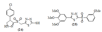 Padmavathi et al.[19] synthesized a series of pyrazole containing 1,3,4-thiadiazoles derivatives and evaluated them for antimicrobial activity. Among the synthesized compounds 5′-[4-(4-chlorophenyl)-4,5-dihydro-1H-pyrazole-3-sulfonylmethyl]-[1′,3′,4′]thiadiazole-2′-thiol (24) showed moderate antibacterial activity against the Gram-positive bacteria