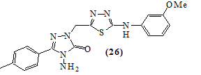 Demirbas et al.[21]synthesized a series of 4-amino-2-[(5-arylamino-4,5-dihydro-1,3,4-thiadiazol-2-yl)methyl]-5-(4-methylphenyl)-2,4-dihydro-3H-1,2,4-triazol-3-ones and investigated its antimicrobial activity. Thiadiazole (26) with 2-({5-[(4-methoxyphenyl) amino] group was found to possess most potent antibacterial activity, whereas N-alkylation at C-5 of thiadiazole ring did not resulted in improved antibacterial activity.