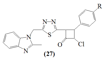 1,3,4-Thiadiazole and 2-azetidinones derivatives of 2-methyl-1H-benzimidazoles were tested for antibacterial, antifungal activity and some of the tested compounds had comparable activity against B. subtilis and E. coli with reference to ampicillin (25 μg/ml). Compounds (27) having o-chloro, o-methyl, p-methoxy, o-hydroxy, and p-amino group in phenyl ring showed good antibacterial activity. Antifungal activity data indicated that some of the derivatives revealed a broad spectrum of activity against tested fungi; however, none of the derivatives showed a better spectrum of activity when compared to the reference drug[22].