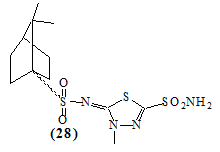 Maresca et al.[23]synthesized a series of (R)-/(S)-10-camphorsulfonyl-substituted aromatic/heterocyclic sulfonamides and evaluated the inhibition of several mammalian isoforms of the zinc enzyme carbonic anhydrase (CA, EC 4.2.1.1). Compounds having R- and S-10-camphorsulfonyl moiety represented more susceptibility toward to inhibition against mitochondrial isoform hCA VA. Generally the R-enantiomer (28) was more active than the corresponding S-isomer.