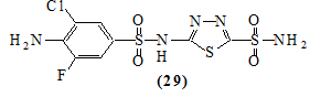 Nishimori et al.[24]investigated the inhibition of various sulfonamides and sulfamates on two β-carbonic anhydrases (CAs, EC 4.2.1.1) isolated from the bacterial pathogen Salmonella enterica serovar Typhimurium. Compound 3-Fluoro-5-chloro-4-aminobenzolamide (29) showed an inhibition constant of 51 nm against stCA 1 and of 38 nm against stCA 2, while acetazolamide inhibited stCA 1 and stCA2 with KI of 59 and 84 nm, respectively.