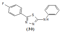 Rollas et al.[25,26] found that one of the thiadiazole derivative, namely 2-(4-chlorophenylamino)-5-(4-aminophenyl)-1,3,4-thiadiazole (30), showed 57% inhibition against Mycobacterium tuberculosis. Further, they found that compound 30 exhibited the highest inhibitory activity (69%inhibition) against in vitro growing Mycobacterium tuberculosis.