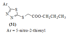 Foroumadi et al.[27] synthesized two series of 2- and 3-[5-(nitroaryl)-1,3,4-thiadiazol-2-yl-thio, sulfinyl and sulfonyl] propionic acid alkyl esters and screened for antituberculosis activity against Mycobacterium tuberculosis and found that the compound 31 that is propyl 3-[5-(5-nitrothiophen-2-yl) -1,3,4-thiadiazol-2-ylthio] propionate was the most active one.
