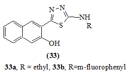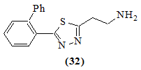 Stillings et al.[28] described the anticonvulsants properties of a number of substituted 2-hydrazino-1,3,4-thiadiazole. Further they found that, 2-(aminomethyl)-5-(2-biphenylyl)-1,3,4-thiadiazole (32) possess potent anticonvulsants properties in rat and mice and compared favorably with the standard anticonvulsants drug phenytoin, phenobarbital and carbamazepine in a number of test situations.