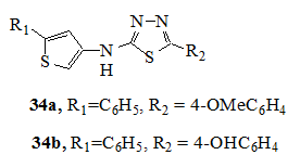 Revelant et al.[30] synthesized a series of 5-aryl-2-(3-thienylamino)-1,3,4-thiadiazoles starting from thiophen-3-isothiocyanates. Those compounds as well as the thiosemicarbazide intermediates were screened for their antiproliferative activity against a panel of six cancer cell lines. Among them, two 5-aryl-2-(3-thienylamino)-1,3,4-thiadiazoles (34a and 34b) have shown very interesting results with IC50 < 10μM on three cell lines