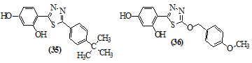 Matysiak et al.[31] have synthesized a series of new 5-substituted 2-(2,4-dihydroxyphenyl)-1,3,4-thiadiazoles and evaluated for their antiproliferative activity against the cells of human cancer lines. He found that derivatives 35 and 36 of different structures prove to be the most active. They exhibited higher inhibitory activity against T47D cells (human breast cancer cells) than cisplatin.