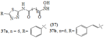 Histone deacetylase (HDAC) inhibitors are a new class of anticancer agents, targeting the biological processes including cell cycle, apoptosis and differentiation. Guan et al.[32] synthesized a series of 1,3,4-thiadiazole based hydroxamic acids derivatives which were found to be potent HDAC inhibitors. Some of them showed good inhibitory activity in HDAC enzyme assay and potent growth inhibition in some tumor cell lines. Among the synthesized compound 37 (IC50 = 0.089 lM), exhibited good inhibitory effect.