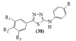 Kumar et al.[33] synthesized a series of 2-arylamino-5-aryl-1,3,4-thiadiazoles and screened them for their anticancer activity against various human cancer cell lines. The novel one-pot synthesis of 1,3,4-thiadiazoles was carried out by refluxing aryl aldehydes, hydrazine hydrate, and aryl isothiocyanates in methanol followed by oxidative cyclization with ferric ammonium sulfate. The compounds 38 having trimethoxyphenyl at the C-5 position exhibited potent anticancer activity with at least twofold selectivity (IC50:4.3–9.2 μM). The nature of substituent on the C-2 arylamino ring is important in determining the selectivity towards a particular cancer cell.