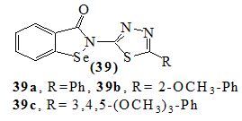 Luo et al.[34] synthesized a series of novel 1,3,4-thiadiazole-containing benzisoselenazolone derivatives by the condensation of 2-chloroselenobenzoyl chloride and 2-amino-5-substituted-1,3,4-thiadiazole and evaluated them for their in vitro antiproliferative activities in SSMC-7721, MCF-7 and A-549 cells. Among the synthesized compounds, the compound 39a showed significant antiproliferative activities in SSMC-7721, MCF-7 and A-549 cells, with IC50 values of 7.15, 3.44 and 3.24 μM, respectively. The compound 39b was found to be the most potent compound in A-549 cells, with IC50 values 2.48 μM. Similarly, the compound 39c also showed highly effective antiproliferative activities in MCF-7 and A-549 cells, with IC50 values of 3.92 and 3.12 μM, respectively.
