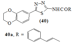 A series of 1,3,4-thiadiazole derivatives containing 1,4-benzodioxan have been synthesized to screen for FAK inhibitory activity[35]. Compound 40a has shown the most potent biological activity against HEPG2 cancer cell line (EC50 = 10.28 μg/ml for HEPG2 and EC50 = 10.79 μM for FAK), which was comparable to the positive control. Docking simulation was performed to position compound 40a into the FAK structure active site to determine the probable binding model. The results of antiproliferative and Western-blot assay demonstrated that compound 40a possessed good antiproliferative activity against HEPG2 cancer cell line. Therefore, compound 40a with potent FAK inhibitory activity may be a potential anticancer agent against HEPG2 cancer cell.