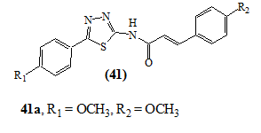 Yang et al.[36] synthesized a series of cinnamic acyl 1,3,4-thiadiazole amide derivatives and evaluated their tubulin polymerization inhibitory activity. Among the synthesized compounds, 41a was found to be the most potent, which inhibited the growth of MCF-7 and A549 cell lines with IC50 values of 0.28 and 0.52 μg/ml, respectively. Compound 41a also exhibited significant tubulin polymerization inhibitory activity (IC50 = 1.16 μg/ml). Docking simulation was performed to determine the probable binding model.