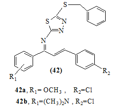 Ahmed et al.[37] synthesized a number of new imine derivatives of 5-amino-1,3,4-thiadiazole-2-thiol, and their anti-depressant activity was tested using imipramine as reference drug. Two compounds namely 5-{[1-(4-chlorophenyl)-3-(4-methoxy-phenyl)prop-2-en-1-ylidene]-amino}- 5-benzylthio-1, 3,4 –thiadiazole (42a) and 5-{[1-(4-chlorophenyl)-3-(4-dimethyl-aminophenyl)-prop-2-en-1-ylidene] amino}-5-benzylthio-1,3,4-thiadiazole (42b) have shown significant anti-depressant activity, which decreased immobility time by 77.99% and 76.26% compared to the standard imipramine (82%). These compounds in the series have passed neurotoxicity tests also.