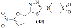 Foroumadi et al.[38] synthesized and evaluated in vitro anti-Helicobacter pylori activity of N-[5-(5-nitro-2-heteroaryl)-1,3,4-thiadiazol-2-yl]thiomorpholines and some related compounds. They found that nitrofuran analog (43) containing thiomorpholine-S,S-dioxide moiety was the most potent compound tested.