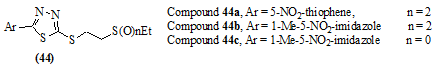 Shafiee et al.[39] synthesized a series of 5-(nitroaryl)-1,3,4-thiadiazoles bearing certain sulfur containing alkyl side chain similar to pendent residue in tinidazole molecule and evaluated against Helicobacter pylori. They found that compound 44a containing 2-[2-(ethylsulfonyl)ethylthio]-side chain from nitrothiophene series was the most potent compound tested against clinical isolates of H. pylori, however, nitroimidazoles 44b and 44c were found to be more promising compounds because of their respectable anti-H. pylori activity.