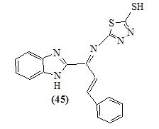Mathew et al.[40] discoverd some novel imines of 2-amino, 5-thio, 1,3,4-thiadiazole as mucomembranous protector. A series of some novel imines of 2-amino, 5-thio 1,3,4-thiadiazole connected to benzimidazole chalcones were prepared. All the newly synthesized compounds were screened for their antiulcer activity in the pylorus-ligated rats. Free radical scavenging activity of all final derivatives was determined by DPPH Diphenyl picryl hydrazide) method. Compound 45 showed the best result.