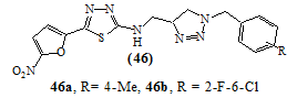 Taghighi et al.[41] synthesized a novel series of 5-(5-nitrofuran-2-yl)-1,3,4-thiadiazol-2-amines by introducing N-[(1-benzyl-1H-1,2,3-triazol-4-yl)methyl] moiety as a new functionality on the C-2 amine of thiadiazole ring via click chemistry. The compounds were evaluated for their in vitro anti-leishmanial activity against promostigote form of the Leishmania major. 4-methylbenzyl analog 46 was found to be the most active compound against promostigotes which significantly decreases the number of intracellular amastigotes per macrophage, percentage of macrophage infectivity and infectivity index.
