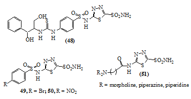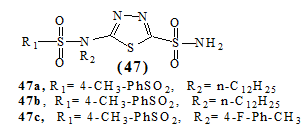 Xiao et al. [42] synthesized a new series of 1,3,4-thiadiazole-2-sulfamide (47) derivatives. Target compounds were assessed by the tool of Dock6. The compounds have been tested for their inhibitory effects on human carbonic anhydrase (hCA II). The results revealed that some derivatives were very effective inhibitors for hCA II. Some compounds have been investigated for their antihypoxic effects, the survival time of mice administered with synthesized derivatives was much longer than that of acetazolamide. In addition, the binding mode of the tested compounds inside the hCA II active site was predicted using a docking technique initially. Among the synthesized compounds 47a, 47b and 47c have shown potent activity.