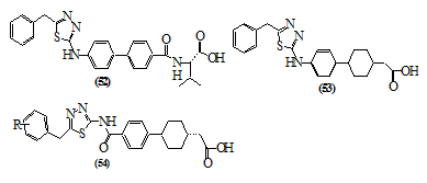 Triacylglycerides (TG) are the principal form of energy storage in eukaryotes. An imbalance in the metabolism of triacylglycerides can participate in the pathogenesis of several metabolic disorders such as obesity, insulin resistance and type 2 diabetes. DGAT-1, diacylglycerol acyltransferase type 1 catalyses the last step of triacylglyceride biosynthesis, transforming diacylglycerol and acyl-CoA into triacylglycerides. Mougenot et al. [45] synthesized new DGAT-1 inhibitors by combining ligand-based modeling from known DGAT-1 inhibitors, high throughput parallel synthesis (HTPS) and rescaffolding chemistry to generate leads. Three lead series were found with IC50s below 100 nM in a DGAT-1 enzymatic assay. The most potent inhibitors belonged to a 2-aminothiadiazole series represented by compound 52 which displayed an IC50 of 0.03 μM in the enzymatic assay. To understand loss of activity, compound 52 and 53 was compared by using ligand-based 3D alignment model and was found that the thiadiazole in 53 is geometrically distorted compared to 52. This observation led to modification of the linker between the thiadiazole and the phenylcyclohexyl group. Amide group was preferred as linker. This choice was supported by the ligand-based alignment for compounds 52 and 54 (with CO inserted) which showed that the amide linker retains a high shape similarity and provides excellent matching of the thiadiazoles. The use of the amide linker restored DGAT-1 inhibition with compound 54 displaying good enzymatic activity (IC50 = 0.036 μM).