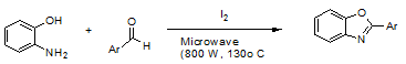 Moghaddam et al. synthesized 2-substituted benzoxazoles (Fig.2) via condensation reaction of 2-aminophenol with various aldehydes using molecular iodine as a catalyst in solvent-free conditions under microwave irradiation at 130°C in short time of span gives excellent yield [5].