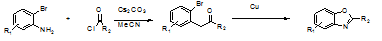 Batley et al. carried out a copper catalyzed one-pot synthesis of benzoxazole (Fig. 3) using bromoaniline and acyl hallides in the presence of a base and solvent giving intermediates which finally gave pure benzoxazole (21–97%) isolated yield, exhibiting a broad range of biological activity. They can also be used as precursors in the synthesis of drugs [6-8].