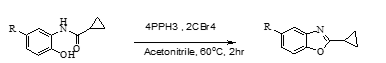 Yang et al. synthesized benzoxazole (Fig. 5) by treatment of N-(2-hydroxyaryl) cyclopropyl amides with PPh3/CBr4 in acetonitrile to yield 2-substituted benzoxazole [10].