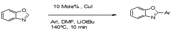 Do et al. carried out copper catalyzed arylation of benzoxazole (Fig. 6) at 2- carbon with aryliodides in DMF with very high yields. This method involves direct functionalization of heterocycle C-H bonds [11].