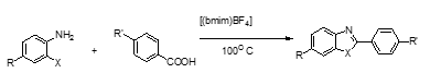 Mardolla et al. synthesized substituted benzoxazoles (Fig. 7) by condensing a variety of carboxylic acids with 2-aminophenol, 2- aminothiophenol and 1, 2-phenylenediamines respectively using the ionic liquid 1-butyl 3-methyl imidazolium tetraflouroborate [(bmim) BF4] at higher temperatures.Ionic liquid acts as a reaction medium and promoter [12].
