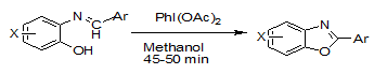 Prakash et al. reported synthesis of 2-benzoxazoles (Fig. 9) using hypervalent iodine (iodobenzene diacetate) mediated oxidative cyclization of Schiff’s bases in methanol as anoxidant. Schiff’s bases were prepared by the reaction of o-aminophenols and aldehydes [14].