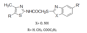 Zitouni et al. synthesized some 2-[(benzoxazole-2-yl) thioacetylamino] thiazole derivative (Fig. 14) by reacting 4-methyl-2-(chloroacetylamino)thiazole derivatives with benzazol-2-thiole in acetone in the presence of K2CO3. The chemical structures of the compounds were elucidated by 1H NMR and FAB+-MS spectral data. The prepared compounds showed mild to significant antimicrobial activity and toxicity [20].