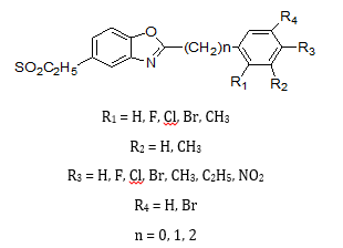 Yildiz et al. synthesized series of 5-ethylsulphonyl-2-(substituted-phenyl/substituted-benzyl and/or phenylethyl) benzoxazole (Fig. 15) derivatives and evaluated for in vitro antimicrobial activity of the compounds against Gram-positive, Gram-negative bacteria, a fungi Candida albicans and their drug-resistant isolates in comparison with standard drugs. Antimicrobial results indicated that the synthesized compounds possessed a broad spectrum of activity with MIC values 250-7.81 mg/ml [21].