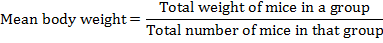 The body weight of each mice in all the groups was measured before infection (day 0) and on day-4 in case of treatment, in the same fashion in case of sub-acute toxicity, it was measured before and after the different doses were given by a sensitive digital weighing balance (Scientech balance).