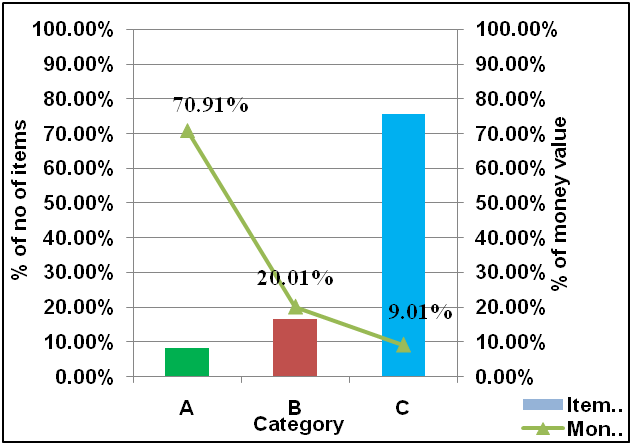 ABC analysis is based on Pareto principle (80-20 rule) which states that 80% of the overall consumption value (expense) is based only on 20% of the total items, i.e. small portion of the items may typically represent the bulk of money value, while a relatively large number of items may form a small part of the money value. ABC analysis is a method for dividing the theon-hand inventory into three classifications A, B, C based on annual consumption unit.“A” items: requiring tight inventory control under more experienced management. Re-orders should be more frequent. “B” items: requiring medium attention for control. “C” items: requiring minimum attention and maybe kept under simple observation. Re-ordering is less frequent [11-13].
