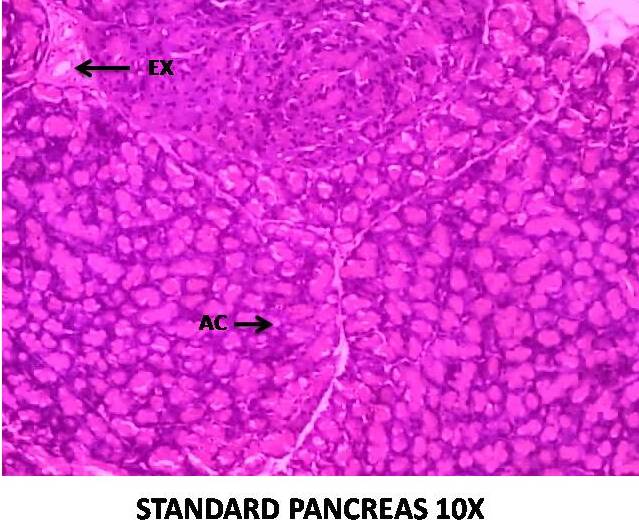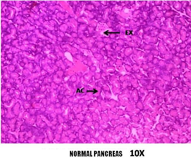 Fig. 1: Normal control (Group I)-Received normal saline has shown the normal architecture of pancreatic tissue with islet of langerhans and acinar cells. (Abbreviation: EX-Exocrine, AC-Acinar)