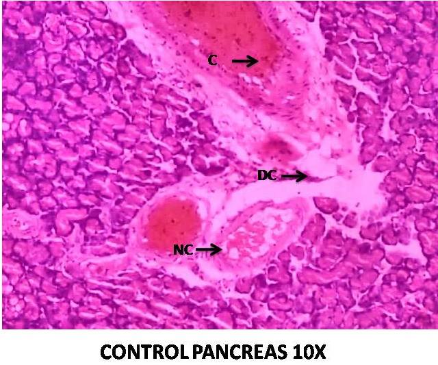 Fig. 2: Diabetic control (Group II)-Treated with dexamethasone 10 mg/kg s. c. observed congestion, degenerative changes and necrotic changes in pancreatic cells indicate structural damage of pancreas. (Abbreviation: C-Congestion, DC-Degenerative changes, NC-Necrotic changes)