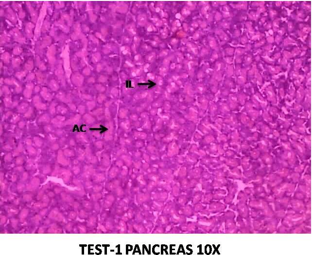 Fig. 4: Test 1 (EECS 200 mg/kg)-The regeneration of pancreatic tissue takes place and shows similar to normal cytoarchitecture. (Abbreviation: AC-Acinar, IL-Islets of langerhans)