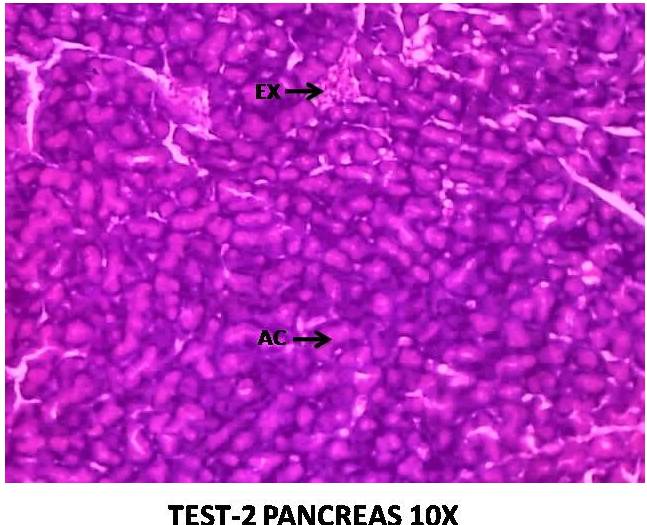 Fig. 5: Test 2 (EECS 400 mg/kg)-regenerative changes take place in pancreatic tissue and show similar to normal cytoarchitecture. (Abbreviation: EX-Exocrine, AC-Acinar)
