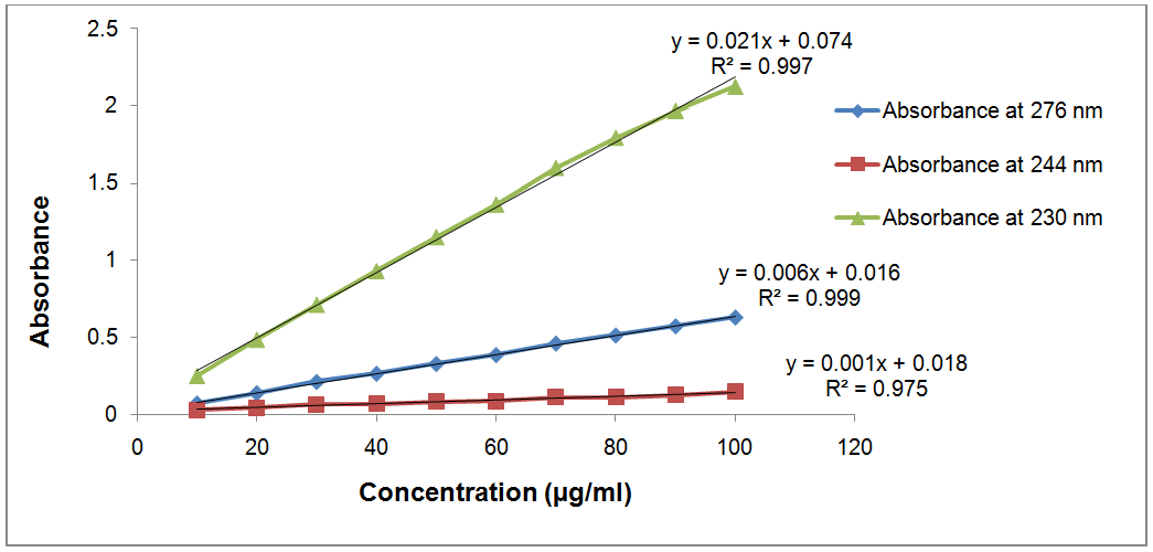 *Absorbance at 276 nm ± S. D | *Absorbance at 244 nm± S. D | *Absorbance at 230 nm ± S. D | Absorptivity at 276 nm | Absorptivity at 244 nm | Absorptivity at 230 nm |