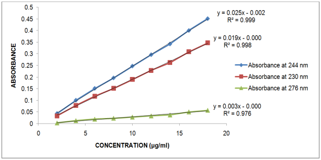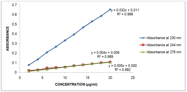 Fig. 6: Standard Calibration Plot of Ambroxol Hydrochloride at 244 nm, 230 nm and 276 nm in pH 6.8 Phosphate Buffer