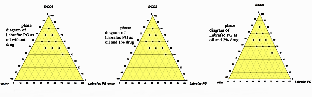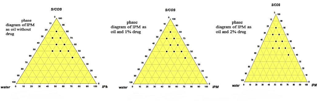 A combination of S and CoS were prepared in the form of mixture with fixed ratio S/CoSmix 3:1 w/w according to the result of % water incorporation method and it was used as one component of the pseudo-ternary phase diagram in addition to water and oil phases. Phase diagrams were constructed by mixing oil, S/CoSmix and water at certain weight ratios into glass vials, the mixtures in the vials were mixed using vortex (stuart, UK) for 2-3 min then incubated at room temperature for 72 h till equilibrium. After equilibrium, the mixtures were assessed visually as NEs [12]. All these points were marked in the phase diagrams and the area covered by these points was considered as the NE region of existence.
